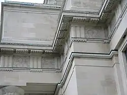 The 1929 building was designed with a view to future extension. Two additions were made to the original building, the first in the late 1950s to commemorate the Second World War when an administration annexe with a large semi-circular courtyard was added to the southern rear.[30] This extension is of concrete-block construction rendered in cement stucco to harmonise with the Portland stone of the earlier building. This major extension was designed by the architects M. K. and R. F. Draffin – one of the original architects and his son.[31]