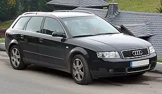 The first generation Audi A4 (known internally as the Typ 8D) debuted in October 1994,[5][6] with production starting November 1994 and European sales commencing in January 1995 for the 1995 model year. North American sales later began in September 1995 for the 1996 model year.[7] It was built on the Volkswagen Group B5 (PL45) platform, which it shared with the fourth generation Volkswagen Passat (B5, Typ 3B). It had a front-mounted longitudinal engine and front-wheel drive. Many variations of the A4 were also available with Audi's quattro four-wheel drive system. The A4 was initially introduced as a four-door saloon/sedan; the Avant (estate/wagon) was introduced in November 1995 and went on sale in February 1996.