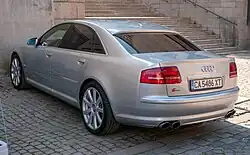 The Audi S8 is a full-size luxury car produced by the German automaker Audi AG, manufactured by Audi Sport GmbH at the Neckarsulm plant, and part of Audi's S model range. The S8 is the high-performance version of the Audi A8, fitted standard with Audi's quattro all-wheel drive system, and was only offered with a short-wheelbase for the first three generations, being joined by a long-wheelbase variant option for the fourth generation.