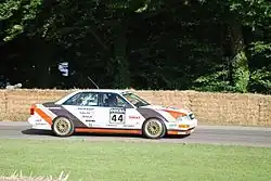 Audi developed a Group A competition version of the Audi V8 for entry into the Deutsche Tourenwagen Meisterschaft (DTM) (German Touring Car Championship) auto racing series equipped with a 309 kW (420 PS; 414 bhp), later 340 kW (462 PS; 456 bhp), 3.6 V8 engine and 6-speed manual transmission, and began racing with it in 1990 with Schmidt MotorSport (SMS) running the operation, and Hans-Joachim Stuck, Walter Röhrl and Frank Jelinski driving.[1][23] In the 1990 DTM season all of the three teams claimed together the entire podium (1st, 2nd and 3rd places) at Hockenheimring race.[24] Stuck won the title, and the following year, Audi added a second team to the mix, Audi Zentrum Reutlingen (AZR). SMS continued with Stuck and Jelinski, while AZR raced with Frank Biela and Hubert Haupt. Biela gave Audi another crown in 1991, but was unable to defend the title in 1992.[2][23][25]