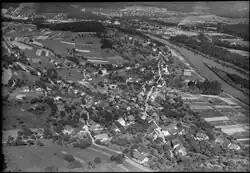 The village was mentioned for the first time in 1212 as Gowenstein.[4] The name probably comes from the small Castle Auenstein on the river Aare, which was built in about 1200 (probably by the lords of Gowenstein). The castle, which was in the possession of the Lords of Rinach until the early 14th century, was burnt down by the Bernese in 1389 as part of the war between the Old Swiss Confederacy and the Habsburgs. The Swiss Confederacy conquered Aargau in 1415. Auenstein belonged to the Bern region (the so-called Bernese Aargau), but the town did not belong to the city itself, rather to some wealthy Bernese families. The reformation occurred in 1528, after which time the owner of the village changed often.