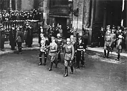 After Hitler gained power in January 1933, Mackensen became a visible, if largely symbolic, supporter of the Nazi regime. A striking visual icon of the Prussian traditions adopted by Hitler's regime, he appeared in his black uniform and death's-head busby at public events organized by the German government or the Nazi Party such as the Day of Potsdam on 21 March 1933. On 26 August 1933, Prussian Minister President Hermann Göring appointed Mackensen to the recently reconstituted Prussian State Council.[23] In 1935, he stood by Hitler's side for the ceremonies of the March 16 Heldengedenktag, or Heroes' Memorial Day, celebrating Hitler's public announcement that Germany would cease to comply with the Treaty of Versailles, and would openly re-arm.[24] One of Mackensen's ceremonial visits brought him to Passau, where he received a hero's welcome.[25]