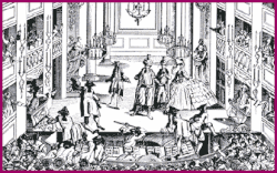 An 1875 postcard from the Victoria and Albert Hall showing the Duke's Company theatre in Dorset Gardens (the so-called "machine house") in operation from 1671 to 1709, which began as a playhouse and gradually became a house for spectacle.