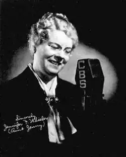Aunt Jenny’s best-remembered aspect was the long-running radio show, Aunt Jenny’s Real Life Stories, which made its debut on CBS on January 18, 1937. The show took the format of a dramatic serial or soap opera, presenting a different story weekly, and running for 15 minutes from 10:45am to 11:00am each weekday morning.[2] The stories featured typical soap opera plots involving the people of a small American town called Littleton. Aunt Jenny herself was not the focus of these stories but served as host and narrator. She also offered cooking instruction, generally in the form of easy recipes which included Spry Vegetable Shortening as an ingredient.