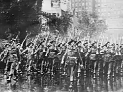 The Australian soldiers returned via America and were given the unique honour of marching in a ticker-tape parade, with fixed bayonets, down Broadway in New York on On Friday 1 October 1943, said to be the only occasion that armed foreign troops had marched through an American city since Independence.[9] Following their return to Australia in November, the forestry companies, undertook jungle warfare training at Canungra and received some new equipment and were later deployed to the Northern Territory and Papua New Guinea.[6][10]