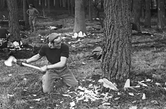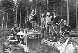 Whereas the Canadians came self-contained and brought logging equipment and sawmill machinery with them, the Australian and New Zealand companies had to be equipped in Britain. Equipment was in short supply and was not what they were used to. Until crawler-tractors were available, converted agricultural tractors had to serve for logging operations. There were no chainsaws, just axes and crosscut saws.[1] Also the winter of 1940–41 was particularly cold and hard on the men. Many had not seen snow before. Another shock was the British requirement to cut trees flush at ground level rather than at two or three feet which meant sometimes kneeling in the snow and mud using clumsy knee pads.[1][3]