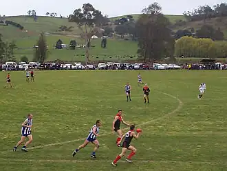 While many early Victorian teams participated in one-off matches, most had not yet formed clubs for regular competition until 1860. To ensure the supremacy of the Melbourne rules, the first-club level competition in Australia, the Caledonian Society's Challenge Cup (1861–64), stipulated that only the Melbourne rules were to be used.[4] This law was reinforced by the Athletic Sports Committee (ASC), which ran a variation of the Challenge Cup in 1865–66.[5] With input from other clubs, the rules underwent several minor revisions, establishing a uniform code known as "Victorian rules".[6] In 1866, the "first distinctively Victorian rule", the running bounce, was formalised at a meeting of club delegates chaired by H. C. A. Harrison,[7] an influential pioneer who took up football in 1859 at the invitation of Wills, his cousin.[8]