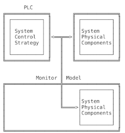 In monitor mode, only the model of the physical system components is required. The control strategy is executed in the PLC and simultaneously controls the real system and the model.