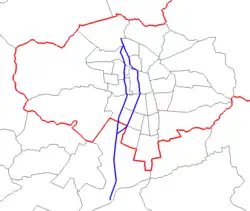 Autopista Central really consists of two highways: The main section runs the full length of the route, and the second, called "Eje General Velásquez", runs further to the west, bypassing the downtown districts. The western route has a length of about 21 km (13 mi), duplicating the route between the municipalities of El Bosque and Conchali.[1]