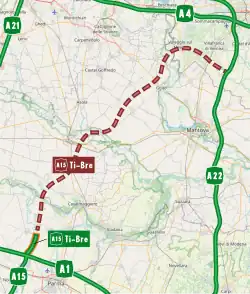 Ti.Bre project (Italian acronym for Tyrrhenian-Brenner) includes the lengthening of highway A15 La Spezia-Parma northbound, from Fontevivo (Parma Ovest) to Nogarole Rocca tollbooth on A22, consisting of 85 km in total.[13]