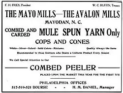 In 1887, Francis Henry Fries, a prominent businessman from Winston-Salem, constructed the Roanoke and Southern Railway, which stretched from his home town to Roanoke, Virginia. Seeking to develop industry along the rail line, Fries erected the Mayo Mill adjacent to the Mayo River in 1895 and established the town of Mayodan.[2] The Mayo Mill could not keep up with demand for yarn, so from 1899 to 1900 a new mill was built two miles to the north.[3] W. C. Ruffin, the superintendent of the Mayo Mills Company, gave it the name Avalon,[4] after Avalon, California.[3] Construction was undertaken by S. S. Ordway & Sons, an independent contractor.[5] At the time the four-story building was the largest textile mill in North Carolina. The south wall of the main building was made of wooden planks so it could be dismantled to allow for expansions and renovations.[6]