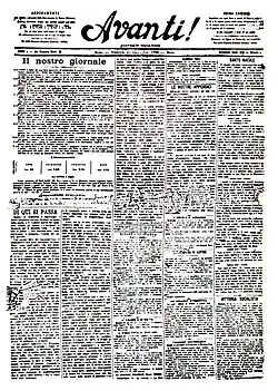 On 23 April 1919, the newspaper, printed in Turin, launched a "solidarity plebiscite" urging its readers and militants to subscribe to support the rebuilding of the Milan headquarters.[23] On 3 May 1920, Avanti! reappeared in the city.[24]