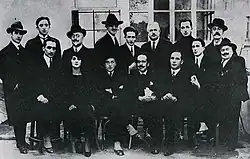 Editorial staff of Avanti! in 1905. From the left, seated, the first is satirical artist Gabriele Galantara and the second is Ivanoe Bonomi. At the middle there is the director Leonida Bissolati. -