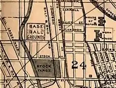 Little is known about this ballpark, as even its location is somewhat sketchy.[5] Contemporary atlases indicate the "Base Ball Grounds" was about two short blocks west of Spring Grove Avenue, bounded on the south by Alabama Avenue, on the west by Mill Creek, on the north by the imaginary line extending from Monmouth Street, and on the immediate east by the Marietta and Cincinnati Railroad tracks. It was a block north of the stockyards, and was straight west of the Cincinnati Work House, which was on the northeast corner of Alabama and Colerain, and which served as the jail.[1]