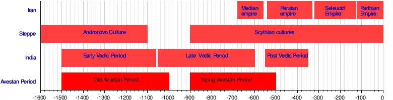 Approximate timeline of the Avestan period (estimates according to Prods Oktor Skjaervo[37]) vis-a-vis several regions inhabited by Indo-Iranian peoples from 1500 BCE to 0 CE. The range for the Old Avestan period represents an uncertainty range rather than a duration, i.e., Zarathustra and his immediate followers may have lived sometime during the indicated time frame.