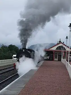 Aviemore railway station serves the town and tourist resort of Aviemore in the Highlands of Scotland. The station, which is owned by Network Rail (NR) and managed by ScotRail, is on the Highland Main Line, 83 miles 31 chains (134.2 kilometres) from Perth, between Kingussie and Carrbridge, and is also the southern terminus of the Strathspey preserved railway.[5]