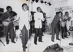 A band of young musicians called Bel Guide National had been active since 1969. This orchestra included N'Yoka Longo, Félix Manuaku Waku, Enoch Zamuangana, Teddy Sukami and Gégé Mangaya as musicians, and also D.V. Moanda as administrator.[29] On 23 December 1969, a young man named Jules Shungu Wembadio—who adopted the stage moniker Jules Presley and was an associate of the Mangaya cousins—attended a rehearsal session of Bel Guide and sang accompanied by Manuaku on guitar.[30] Moanda, impressed by Jules' performance, then decided to dissolve Bel Guide to form a new ensemble by keeping Jules and some team members.