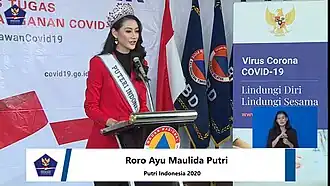 11. ^ a b c d Indonesian, National Board for Disaster Management. "Puteri Indonesia 2020, Raden Roro Ayu Maulida Putri Beri Dukungan Moril Kepada Gugus Tugas COVID-19". Indonesian National Board for Disaster Management (in Indonesian). Retrieved April 4, 2020.