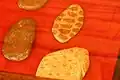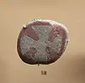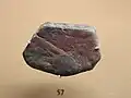 Painted, and sometimes engraved pebbles (or "cobbles") are a feature of core Azilian sites; some 37 sites have produced them. The decoration is simple patterns of dots, zig-zags, and stripes, with some crosses or hatching, normally just on one side of the pebble, which is usually thin and flattish, and some 4 to 10 cm across. Large numbers may be found at a site. The colours are usually red from iron oxide, or sometimes black; the paint was often mixed in Pecten saltwater scallop shells, even at Mas d'Azil, which is far from the sea. Attempts to find a meaning for their iconography have not got very far, although "the repeated combinations of motifs does seem to some extent to be ordered, which may suggest a simple syntax". Such attempts began with Piette, who believed the pebbles carried a primitive writing system.[12][13]