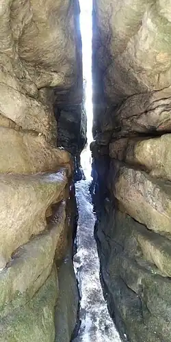 At the bottom of the Upper Cretaceous sea, thick layers of sandstone were deposited. In the Tertiary, during the Alpine orogeny, they were lifted out along with the entire Sudetes. Then, a long period of erosion and the removal of weathering began.[1] As a result of the uneven resistance of individual rock layers to weathering and the widening of fissures that cut through the massif in three directions, corridors of variable width, several meters deep, were created.[1]
