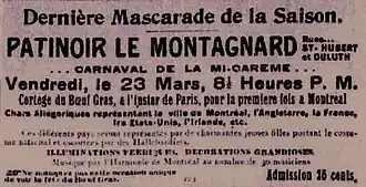 In Montreal, on Friday, March 23, 1900, the day after Mi-Carême Thursday, a Bœuf Gras parade was organized for the first time. It took place in the evening on the ice of a skating rink, protected by walls from the aggressive winter cold, and was open to spectators for an entrance fee. The parade features floats representing, among others, the city of Montreal, England, France, the United States, and Ireland, with young girls in national costume escorted by halberdiers. Thirty musicians from l'Harmonie de Montréal provide the soundscape against a backdrop of lighting effects.[5] In 2010, a float bearing a statue of a Bœuf Gras (Fat Ox) paraded on Mardi Gras.[6]