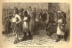 February 8, 1807. - Orléans butchers' festival and fat ox walk in the city. A huge animal, covered in a scarlet cloak, its horns adorned with flowers and ribbons, carrying on its back a pretty six-year-old child dressed as a lover, with a bow in his hand and a quiver on his back, was followed by more than fifty butcher boys, neatly dressed in white jackets, bonnets and aprons, partly on horseback and partly on foot; The procession traveled a good portion of the city, bursting with noisy joy, and stopped in front of the homes of Orléans' principal inhabitants, as well as at the doors of the best practices, whose generosity was used to make a splendid gala that rounded off the festivities.[27]