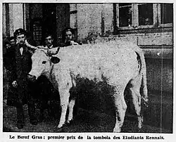 The first prize in the Rennes student tombola for Mi-Carême 1938 is a Bœuf Gras.[35]