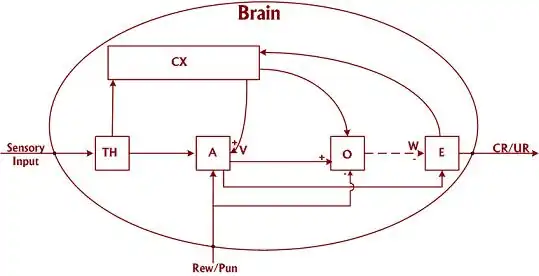 This image shows that the sensory input enters through the thalamus TH. In biological systems, the thalamus takes on the task of initiating the process of a response to stimuli. It does so by passing the signal to the amygdala and the sensory cortex.[8] This signal is then analyzed in the cortical area – CX. In biological systems, the sensory cortex operates by distributing the incoming signals appropriately between the amygdala and the orbitofrontal cortex.[9] This sensory representation in CX is then sent to the amygdala A through the pathway V. This is the main pathway for learning in this model. Reward and punishment enter the amygdala to strengthen the connection between the amygdala and the pathway. At a later stage if a similar representation is activated in the cortex, E becomes activated and produces an emotional response.