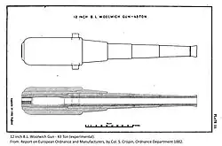 On 24 May 1880, the government ordered a competing 12-inch 43-ton gun at Elswick Ordnance Company (EOC). Manufacture of this gun lasted from June 1880 to August 1881.[19] The Elswick 43-ton was tested in August 1881.[15] A drawing of the gun showed that its tube was coiled till the muzzle.[20]