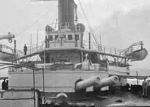 Collingwood (1882) had four Mark II guns mounted in barbette (i.e. open) towers. In March 1885, twenty four rounds were fired from the front barbette guns of Collingwood. The maximum charge used was 295 pounds (134 kg).[41]