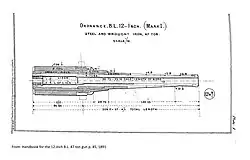 The Mk's III-VII had the same length and chamber capacity as the Mk I/II. They also seemed to have the same capabilities as the MK I/II.[48] The common ballistic tables for Mk I - IV, that were made before the 1886 incident on Collingwood also indicated that the internal construction differences were a mere detail.[49] After the incident on board Collingwood, the Mk I/II's were chase hooped, which increased their weight to 47 tons.[45][27]