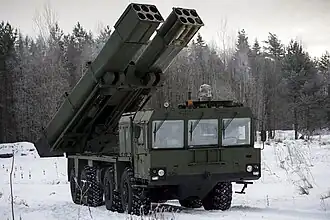 • Uragan-1M: Variant presented to the public in 2007; all processes are automated. Can also fire the 300 mm rockets of the BM-30 Smerch system.[12] Reloading is simplified by substituting barrels; can be fitted with two banks of six 300 mm launch tubes or fifteen 220 mm launch tubes. Deliveries to the Russian Army started as of September 2016.[13][14][15] Can fire guided 220 mm rockets with a range of 70 km (43 mi).[16] On Belarusian MZKT 8x8 military truck chassis.[14]