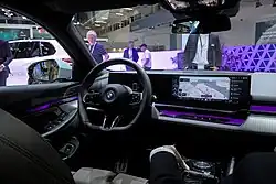 The BMW Interaction Bar, which debuted in the G70 7 Series, is an optional feature on the base models and standard on the i5. It adds touch-sensitive control points for air conditioning and the hazard light,[20] and a slim, backlit control panel that runs across the entire dashboard and into the front doors.[27]
