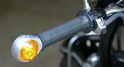 U.S. motorcycles came standard with a narrow dual saddle, though wide dual saddles with chrome rear handles could be ordered. Solo saddles made by Pagusa or Denfeld for driver and passenger were also available. All motorcycles came with a tool kit. Hella turn signals were optional (photo below left), and were mounted at the ends of the handlebars showing light both forward and back.