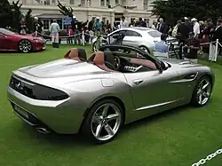 The Zagato Roadster was the roadster version of the Zagato Coupé that was unveiled three months earlier, and was introduced at the Pebble Beach Concours d'Elegance on 19 August 2012. The Zagato Roadster was manufactured in six weeks, from the first design idea to the finished model.[47] Similar to the Zagato Coupé, the paint work of the Roadster changes appearance according to the lighting, ranging from dark grey to a light silver. The roadster does away with the retractable hard-top of the Z4 and incorporated a tonneau cover for protection of the interior which incorporates a double-bubble shape.[48] The Zagato roadster has a black interior, with a strip of brown leather trim extending to the roll-over hoops.[49]