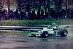 The BRM P160C specification began the 1973 before being replaced by the BRM P160D and BRM P160E spec versions mid-season. Beltoise was joined by Clay Regazzoni and Niki Lauda, The 1973 Argentine Grand Prix saw Regazzoni finish seventh, Beltoise retire when his engine failed and Lauda also retire with oil pressure failure.[30] At Brazil, the Swiss finished sixth, the Austrian eighth and the Frenchman retired with electrical problems.[31] The South African Grand Prix was a bad race for BRM as all of their drivers retired; Beltoise's clutch failed, Lauda's engine failed and Regazzoni crashed and was hit by Mike Hailwood who went to pull the Swiss driver from his burning car. Hailwood's driving suit caught fire, but after being extinguished by a fire marshall he returned to help rescue Regazzoni, an act for which he was awarded the George Medal.[32] In Spain, the Frenchman finished fifth, the Swiss ninth and the Austrian retired with tyre problems.[33] The Belgian Grand Prix saw Lauda fifth, Regazzoni 10th after an accident and Beltoise was fourteen laps down and was not classified.[34] The 1973 Monaco Grand Prix was a bad race for BRM with all of their drivers retired, Beltoise had an accident, Lauda's gearbox broke and Regazzoni's brakes failed.[35] The Swedish Grand Prix saw the Swiss ninth, The Austrian thirteenth and the Frenchman retire with engine failure.[36] At France, Lauda finished ninth, Beltoise 11th and Reggazoni 12th.[37] The British Grand Prix saw the Swiss seventh, the Austrian 12th and the Frenchman retired because he was involved in a first lap crash and did not restart.[38] In Holland, Beltoise finished fifth, Reggazoni eighth and Lauda retired with a fuel pump failure.[39] The German Grand Prix was a bad race for BRM with all of their drivers retired, The Frenchman's gearbox broke, The Swiss's engine failed and the Austrian's suspension failed, causing an accident from which he escaped with a broken wrist.[40] The accident forced Lauda to miss his home race in Austria but on Lauda's home track Beltoise finished fifth and Regazzoni sixth.[41] The Italian Grand Prix, saw the Frenchman finish 13th, the Austrian retire with an accident and the Swiss also retired when his ignition failed.[42] Peter Gethin replaced Regazzoni for Canada but he retired with a broken oil pump. Lauda also retired with a transmission failure and Beltoise finished fourth.[43] The 1973 United States Grand Prix saw the Swiss eighth, the Frenchman ninth and The Austrian retire with a broken oil pump.[44]