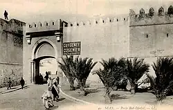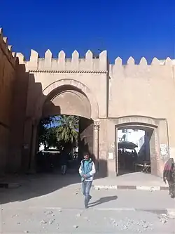 Originally, it was called Bab Jedid (the new door), as it was the first gate to be built in the end of the 19th century, more than 1000 years after bab Jebli and Bab Diwan, the medina's oldest gates.[1] The gate got its current designation from the Kasbah located at its east.