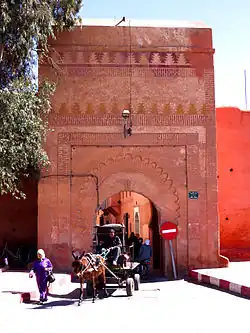 The Kasbah of Marrakesh, built by the Almohad sultan Yaqub al-Mansur, is the site of the Kasbah Mosque, the El Badi Palace and the Saadian Tombs. Bab Ksiba was the entrance to another small kasbah (ksiba or qusayba) which was adjoined to the southwestern corner of the main kasbah in order to protect the western side of the Grand Mechouar (a vast open square, still present today, at the entrance of the royal palace) and the Derb Chtouka neighbourhood.[1] The date of its construction is unclear; it existed at the beginning of the 19th century and may have been built under Muhammad ibn Abdallah in the 18th century, but was almost certainly not part of the original Almohad kasbah.[1]: 501