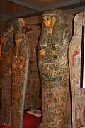 It contained 254 richly decorated coffins (101 double sets) giving 153 coffin sets in total, as well as 110 shabti boxes, 77 Osirian wooden statuettes (mostly hollow and containing a papyrus), 8 wooden steles, 2 large wooden statues (Isis and Nephthys), 16 canopic reed baskets, 5 round baskets made of woven reed.[6] The coffins were made almost exclusively with wood from the native fig tree, the Ficus sycomorus.[7]