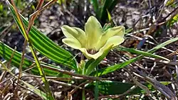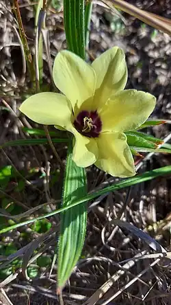 Babiana pygmaea, known in English as the cream bobbejaantjie,[2] is a perennial plant of about 10 cm (3.9 in) high that annually forms leaves and flowers from an underground corm that is assigned to the iris family. It has bowl-shaped, pale yellow flowers with six perianth lobes, purplish in its heart, emerging from a cylindrical tube, and lance-shaped, pleated and heary leafblades that are almost at a right angle with the sheaths. The species can be found in the Western Cape province of South Africa.[1] It is called geelbobbejaantjie in Afrikaans.[3]