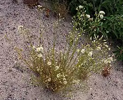 This is a shrub generally growing 40-100 centimeters (16-40 inches) in height, and known to exceed 2 meters (80 inches) at times. The erect stems have a woody base and are mostly hairless, but may be sparsely hairy near the ends of the branches. The narrow, widely spaced leaves are linear or lance-shaped and smooth-edged or slightly serrated, and measure 1.5 to 6.5 centimeters in length but only a few millimeters in width. They are glandular and hairless or with few hairs. The inflorescence is an elongated cluster of many flower heads containing twenty to thirty or more male or female flowers. The fruit is a hairy achene tipped with a plumelike white pappus about 7 millimeters long.[4]