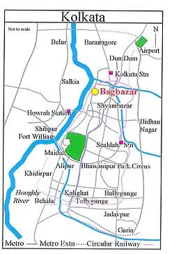 The old Chitpur Road (renamed Rabindra Sarani) was for many years the life line of Bagbazar. It followed the same track as the old pilgrim path built by Sabarna Roy Choudhury from Halisahar to Barisha.[9] Tram tracks along Rabindra Sarani came to Bagbazar in 1904[10] and being renewed in 2007. Finally Tram service closed along Rabindra Sarani in Bagbazar since 2012 due to construction of Green Line.[11] While Rabindra Sarani cuts across Bagabazar from north to south, Bagbazar Street cuts across from Bagbazar Ghat in the west to Bidhan Sarani in the east. Girish Avenue is an extension of Chittaranjan Avenue.[12] When it was built in the 1930s, a portion of the house of Girish Chandra Ghosh was spared and stands in the middle with the two flanges of the road on both sides of the house. There are numerous lanes and bylanes in Bagbazar.