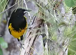 The Bahama oriole is a black and yellow oriole that has small white markings on the wings and tail. It shows the most yellow out of all the Caribbean orioles. The adult male and females are mostly black with yellow underparts, ranging from the mid-breast to the vent, thighs, rump, and lower back.[4] The greater coverts and primaries are thinly fringed with white. The wing linings are yellow and the outer tail feathers have small white tips. The bill and eyes are dark black, and the legs are blue-grey. Like most tropical oriole species, the females are similar or identical to the males in coloring.[5] The immature Bahama oriole is more of an olive-grey with the head a yellowish color.[4]