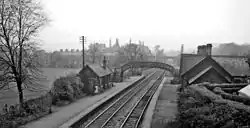 Opened by the Midland Railway in December 1876,[1] the station became part of the London, Midland and Scottish Railway during the Grouping of 1923, and then passed to the North Eastern Region of British Railways on nationalisation in 1948. It was then closed by the British Transport Commission as an economy measure in January 1953, though it briefly reopened for three months in 1957 due to a petrol shortage during the Suez Crisis.[2] The goods yard had a single road shed, and two loading docks, being located on the west side of the station.[2] The station is recorded as having a steam crane that could handle loads of just over 1-tonne (1.1-ton).[3] Goods traffic at the station ceased in April 1964,[4] and the goods yard site is now the location of a housing estate.[5]