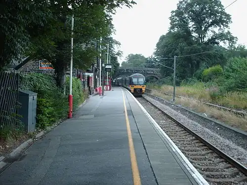 In February 1983, the line was reduced to single track, so there is only one platform, and the station building has been sold. The station building is architecturally similar to the smaller stations on the Settle Carlisle Line, as it was built in the same era as the Settle line.[5] The track remains in place on the former eastbound line (towards Guiseley).[11] The second platform is disused and covered in weeds. The station is located 4 miles (6.4 km) north of Bradford Forster Square, and 2 miles 79 chains (4.8 km) south-west of Guiseley railway station.[12] Electrification of the line was authorised in the 1990s and completed in 1995.[13]