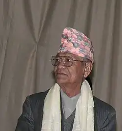 Til Bikram Nembang Limbu, professionally known as Bairagi Kainla or Bairagi Kaila, is a Nepalese poet and litterateur.[1][2][3] He has served as Chancellor of the Nepal Academy from 2009 (2066 BS) to 2013 (2070 BS).[4] Part of his significant literary struggle was the Tesro Aayam (Third Dimension) movement. During the early 1960s, he, along with Ishwor Ballav and Indra Bahadur Rai, searched unexplored realms of Nepali literature and added a new dimension – the third dimension – to Nepalese literature.[5]
