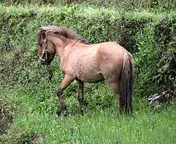 The Baise (also known as the Guangxi) is a pony-sized horse breed native to the autonomous region of Guangxi, in southeastern China.[1] Like other Asian breeds (the Mongolian horse in particular), it thrives at high altitudes and roams freely when not working. Guangxi's mild climate has long favored horse breeding; bronze statues from the third to the first centuries BCE exist of horses very similar in conformation to the Baise.