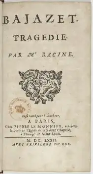 Bajazet (French: [baʒazɛ]) is a five-act tragedy by Jean Racine written in alexandrine verse and first performed at the Hôtel de Bourgogne theatre in January 1672, after Berenice, and before Mithridate. Like Aeschylus in The Persians, Racine took his subject from contemporary history, taking care to choose a far off location, the Ottoman Empire. In 1635, the sultan Murad IV (Amurat, in the work of Racine) had his brothers and potential rivals Bajazet (Bayezid) and Orcan (Orhan) executed. Racine was inspired by this deed, and centered his play on Bajazet. Racine also develops several romantic subplots in the seraglio. The action is particularly complex, and can only be resolved by a series of deaths and suicides.