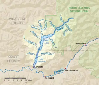 The Baker River (Lushootseed: dxʷqəlb)[3] is an approximately 30-mile (48 km),[1] southward-flowing tributary of the Skagit River in northwestern Washington in the United States. It drains an area of the high North Cascades in the watershed of Puget Sound north of Seattle, and east of Mount Baker. With a watershed of approximately 270 square miles (700 km2) in a complex of deep valleys partially inside North Cascades National Park, it is the last major tributary of the Skagit before the larger river reaches its mouth on Skagit Bay. The river flows through Concrete, Washington, near its mouth and has two hydroelectric dams owned by Puget Sound Energy.