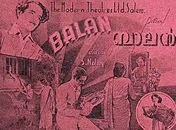 Balan is a lost 1938 Indian Malayalam-language drama film produced by T. R. Sundaram under the banner of Modern Theatres, directed by S. Nottani and written by Muthukulam Raghavan Pillai.[2] It is notable for being the first sound film in the Malayalam language, and the third feature film in Malayalam cinema after Vigathakumaran and Marthanda Varma.[3][4] Based on the short story Vidhiyum Mrs. Nayarum by A. Sundaram. The film is a melodrama about the struggle of two orphaned children. The film stars K. K. Aroor in the title role and M. K. Kamalam as the female lead, with Master Madanagopal, M. V. Shanku, K. Gopinath, Alleppey Vincent and C. O. N. Nambiar in supporting roles.[5][6]